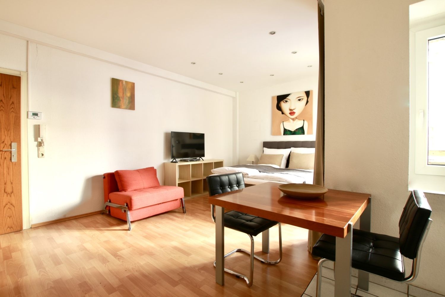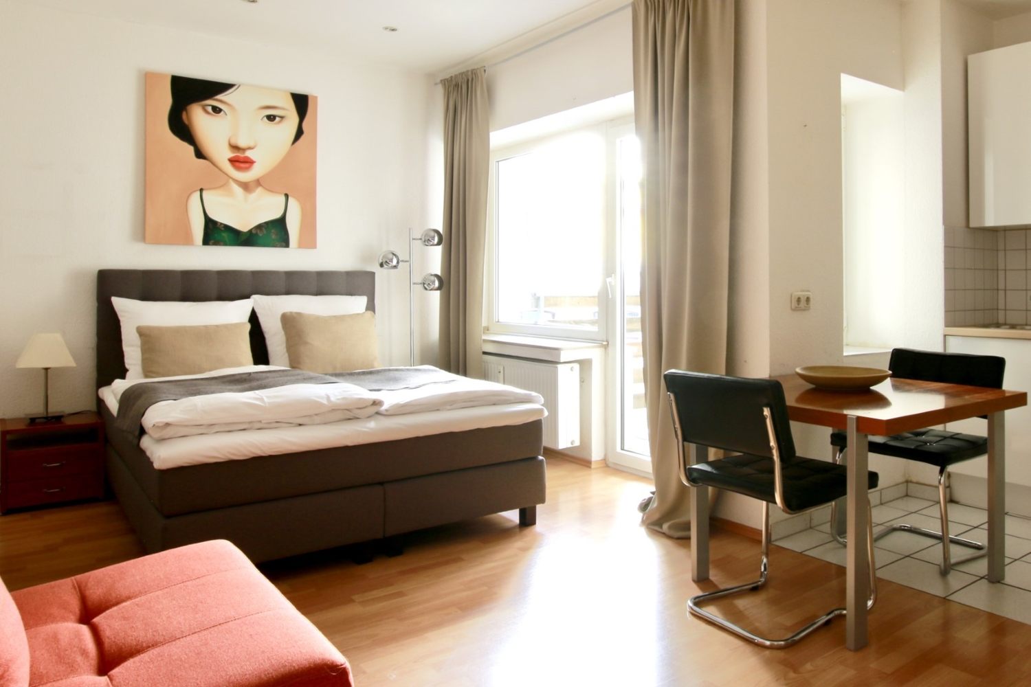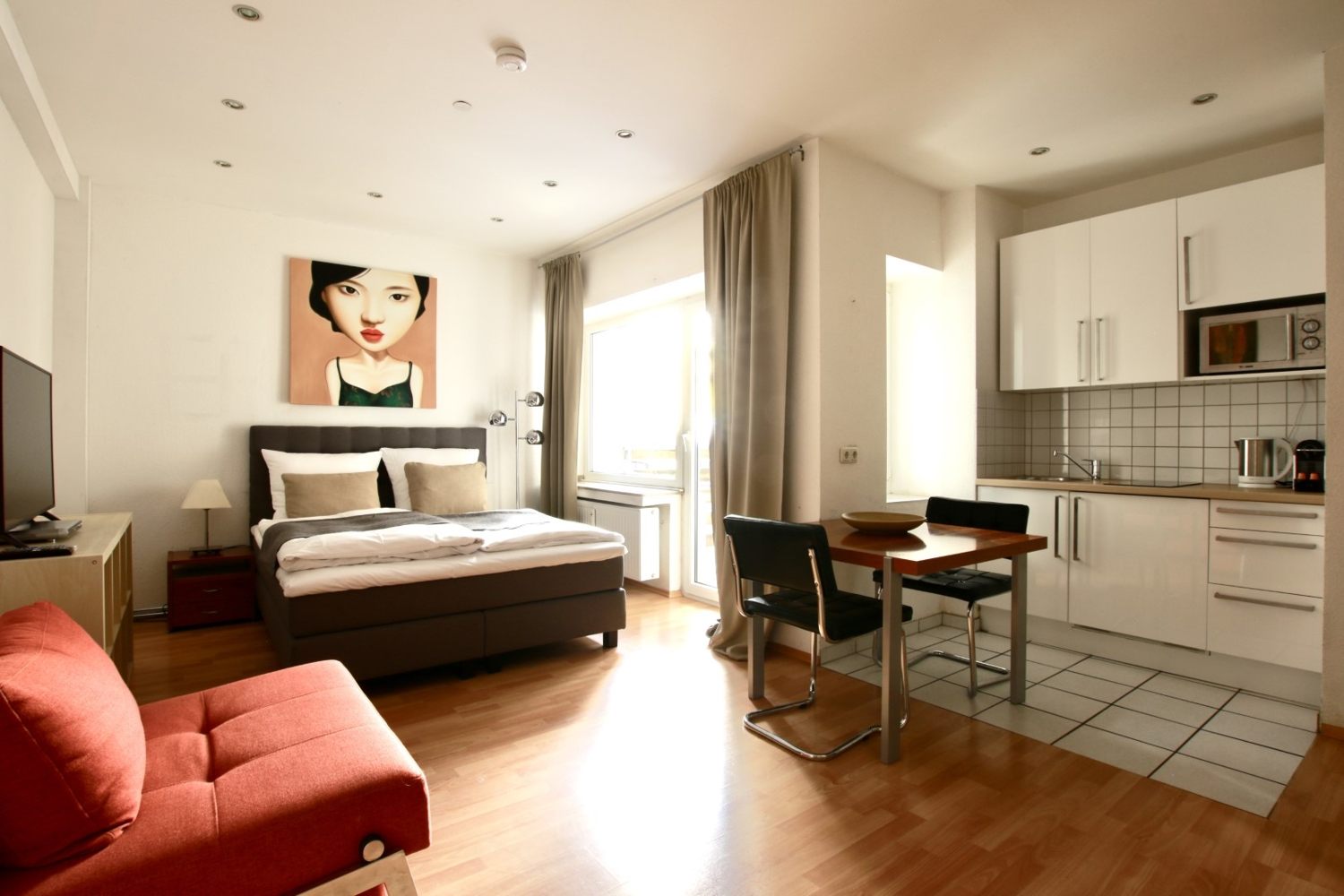 Balkon, Wohn-/ Schlafzimmer mit französischem Bett 1,40 m, Bettwäsche und Handtücher vorhanden, Tierhaltung nicht gestattet, Rauchen nur auf dem Balkon gestattet, inkl. WLAN Internetanschluss, Reinigungs- und Wäscheservice gegen Aufpreis optional, Mindestmietdauer 3 Monate