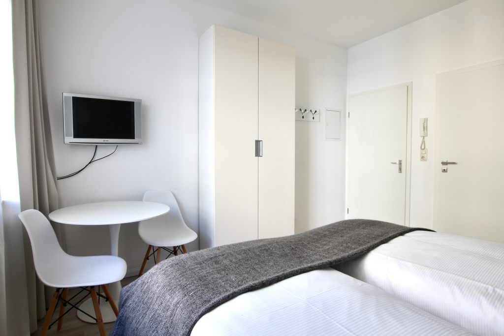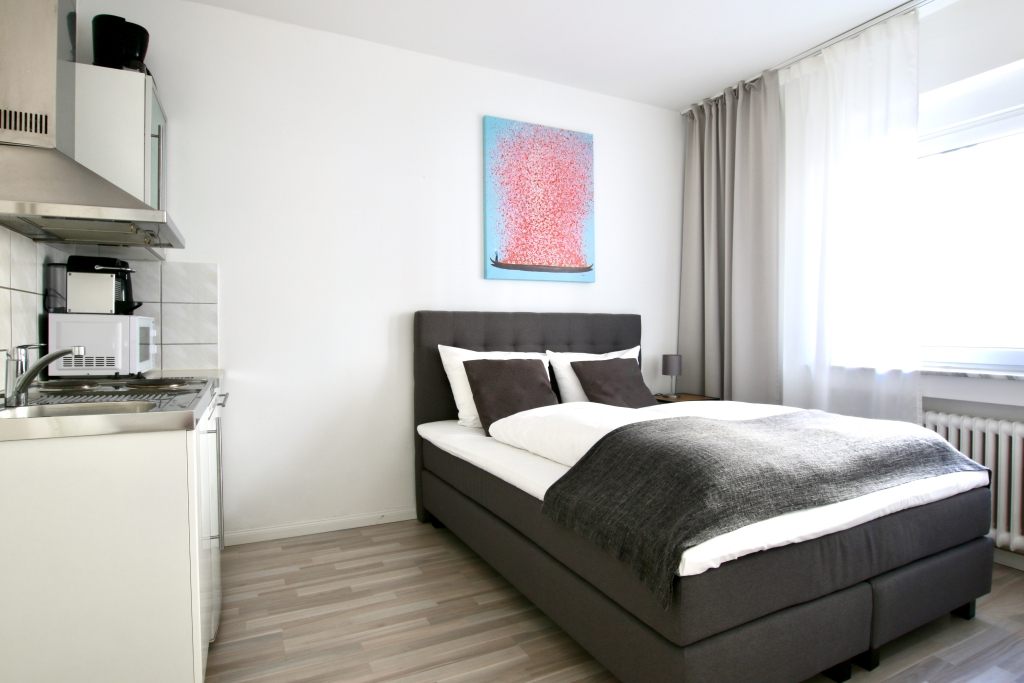 Wohn/Schlafzimmer mit französischem Bett 1,40 m, Bettwäsche und Handtücher vorhanden, Nichtraucher, inkl. WLAN-Internetanschluss, Reinigungs- und Wäscheservice Auf Wunsch gegen Aufpreis, Mindestmietdauer: 3 Monate