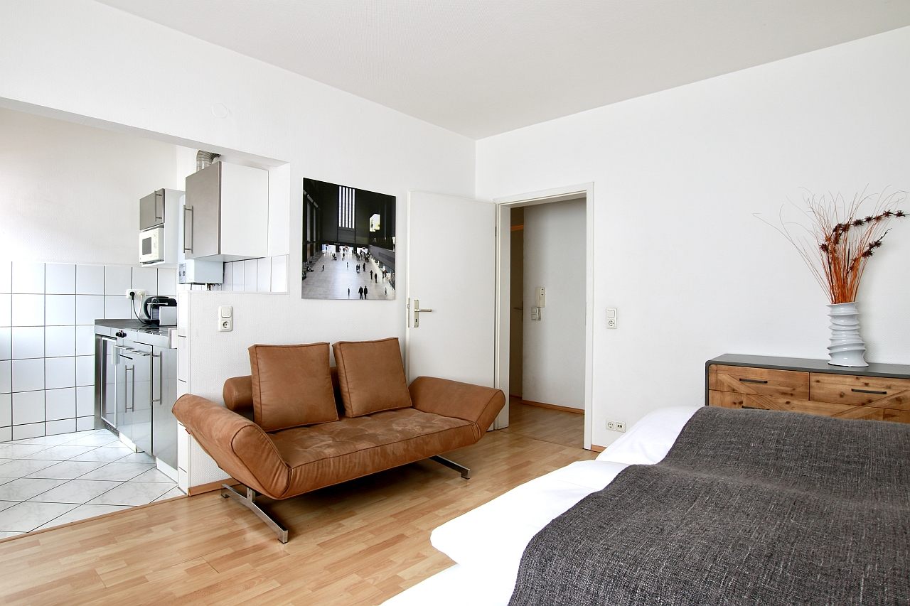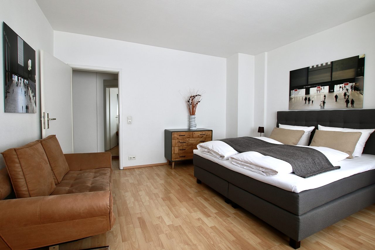 Wohn/Schlafzimmer mit Boxspringbett 1,80, Bettwäsche und Handtücher vorhanden, Reinigungsservice auf Anfrage gegen Aufpreis möglich, WLAN inkl., max. 2 Personen, Mietpreis gilt für 1 Person, Mindestmietdauer 2 Monate,