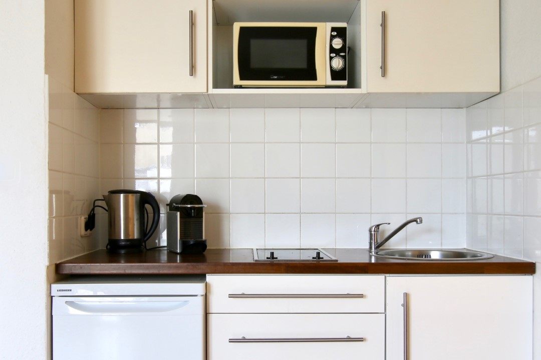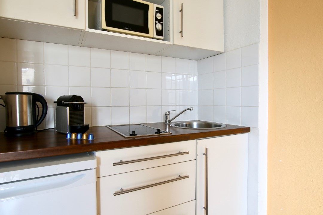 Moderne Möblierung, Laminatboden, Singleküche mit Mikrowelle und Herd, Kaffeemaschine, Duschbad, TV, WLAN-Internetanschluss