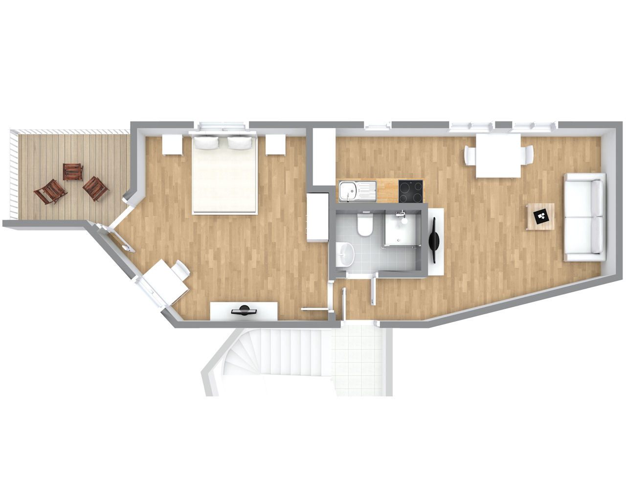 Wohnzimmer mit Schlafsofa, Schlafzimmer mit Doppelbett 1,60 m, Bettwäsche und Handtücher vorhanden, inkl. WLAN-Internetanschluss, Reinigungsservice gegen Aufpreis möglich, max. 2 Personen, Mindestmietdauer 2 Monate