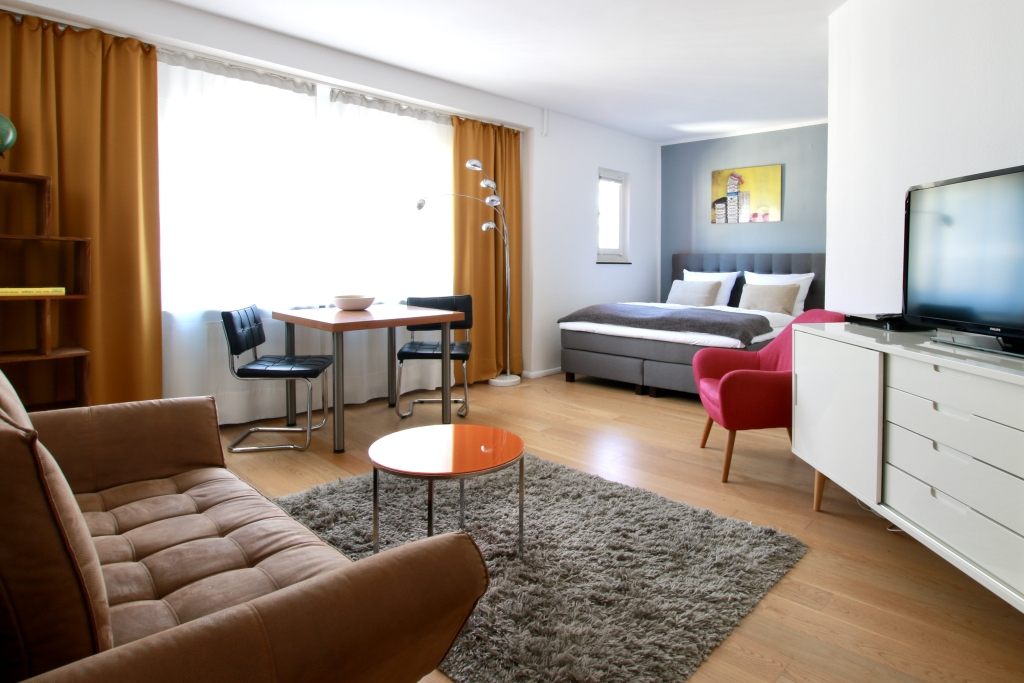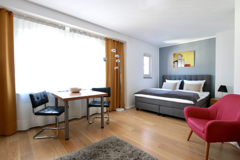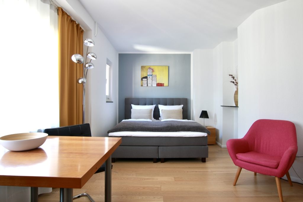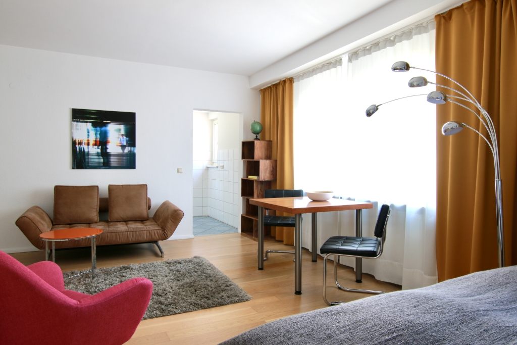 Wohn/ Schlafzimmer mit Doppelbett 1,60m, Reinigung + Bettwäscheservice auf Anfrage (gegen Aufpreis) möglich, inkl. kostenlosem WLAN-Internetanschluss, Tierhaltung nicht gestattet, Mindestmietdauer 2 Monate,