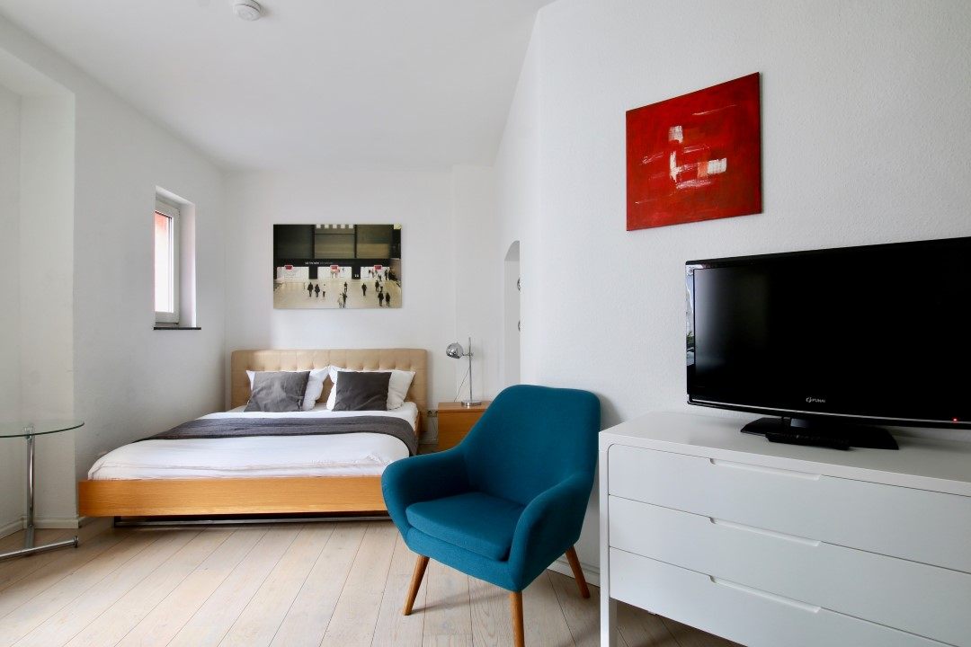 Wohn/Schlafzimmer mit franz. Bett 1,40 m, Bettwäsche- und Reinigungsservice auf Anfrage (gegen Aufpreis) möglich, DSL WLAN-Internetanschluss inkl.,