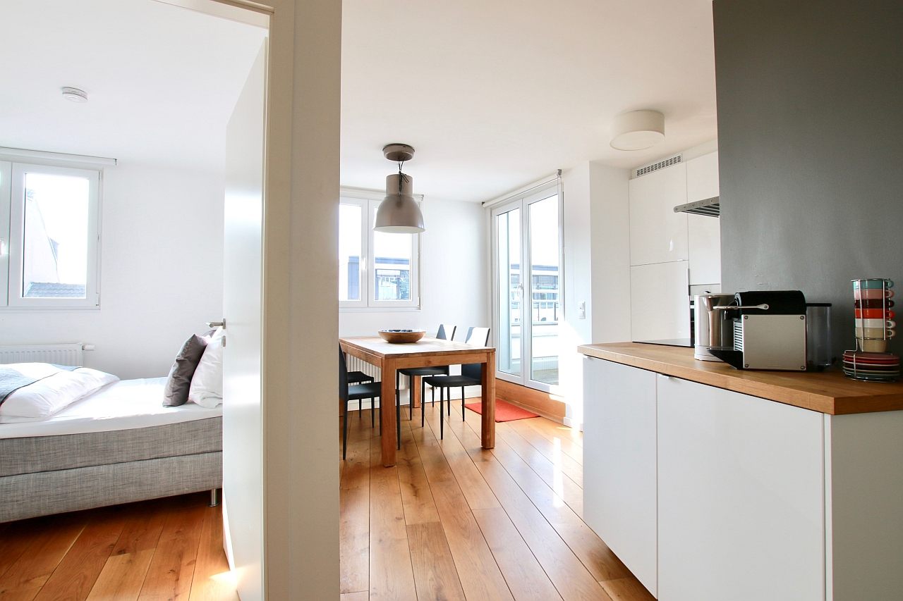 Moderne Möblierung, Parkettboden, voll ausgestattete integrierte Einbauküche, Badezimmer mit Dusche und Tageslicht, TV, DVD, WLAN Internetanschluss, Waschmaschine