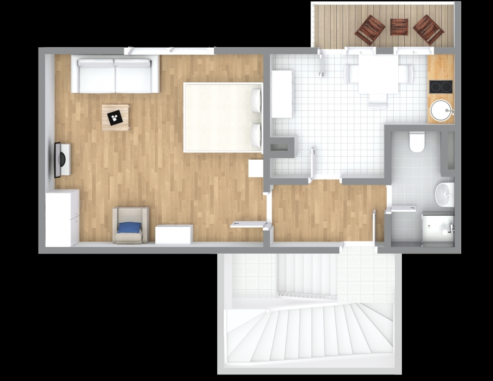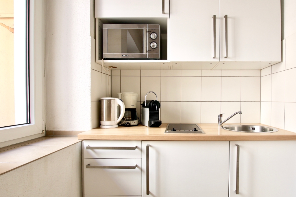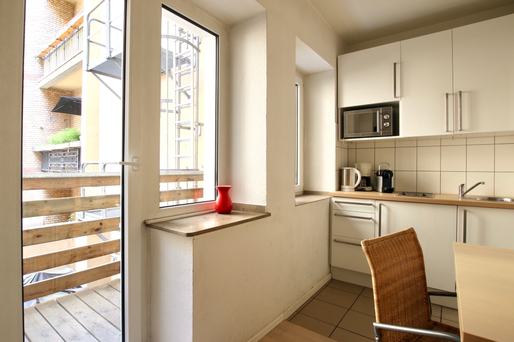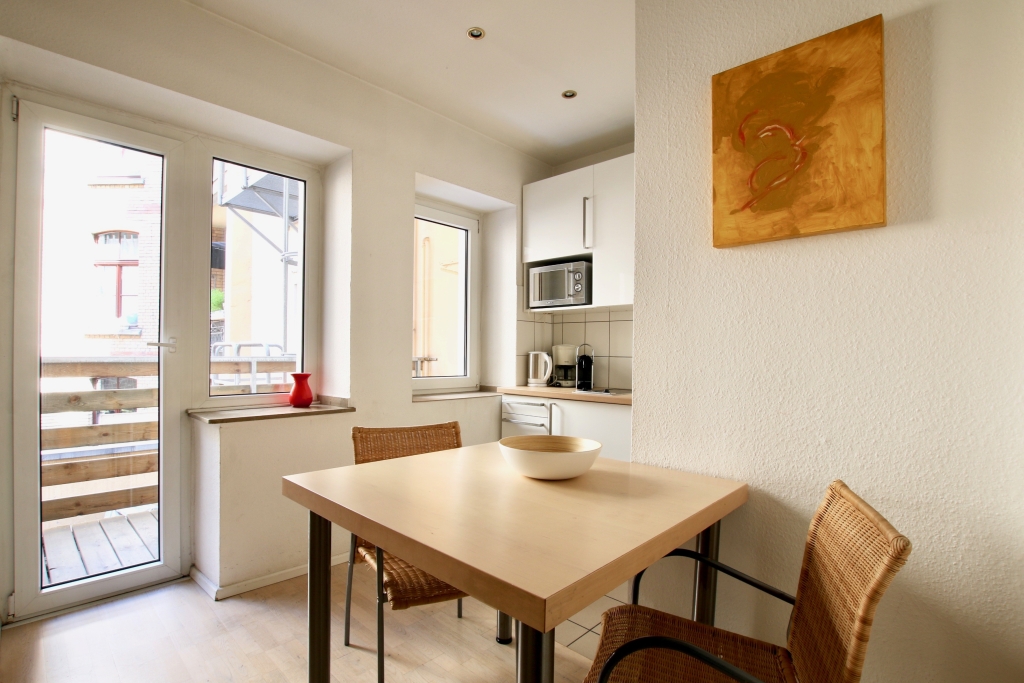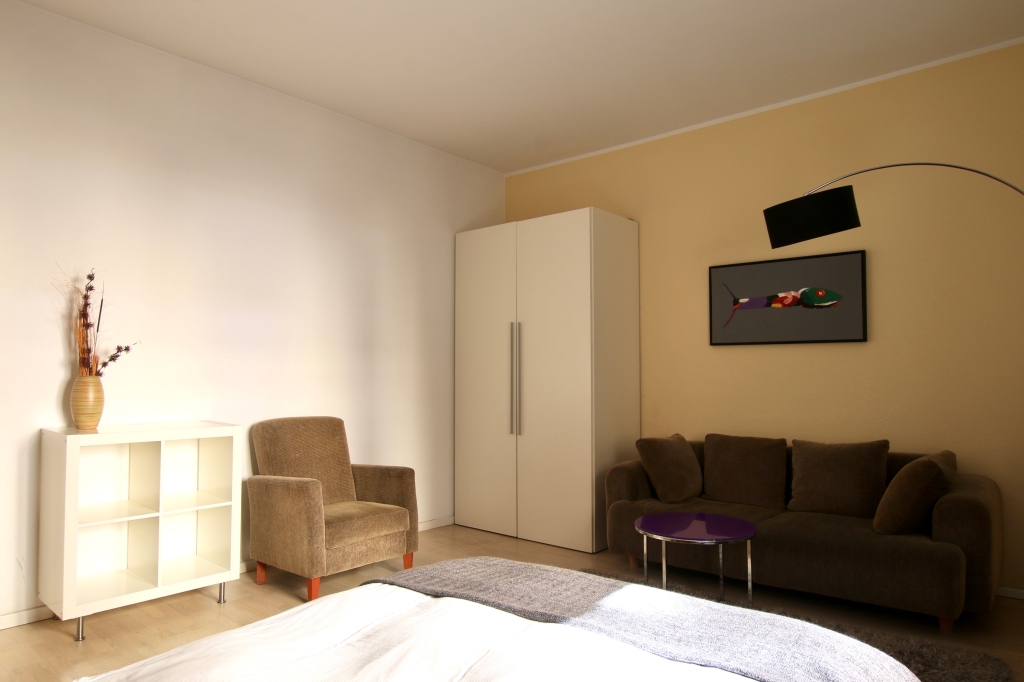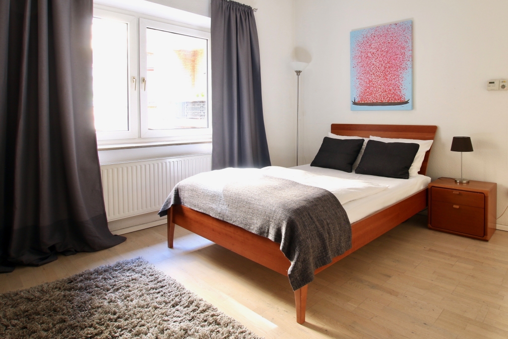 Balcony, bedroom with queen-size bed 1.40 m, bed linen and towels available, pets not allowed, smoking only on the balcony, WiFi internet connection incl., cleaning and laundry service against a surcharge optionally, minimum term of lease 3 months