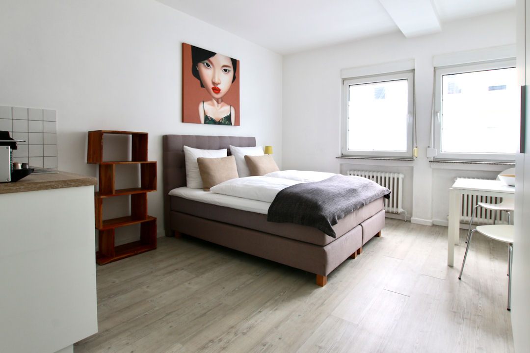 Bedroom with queen-size bed 1.40 m, bed linen and towels available, pets not allowed, non-smoking, WiFi incl., cleaning and laundry service against a surcharge optionally, minimum term of lease 6 months, plus final cleaning 140,00 €