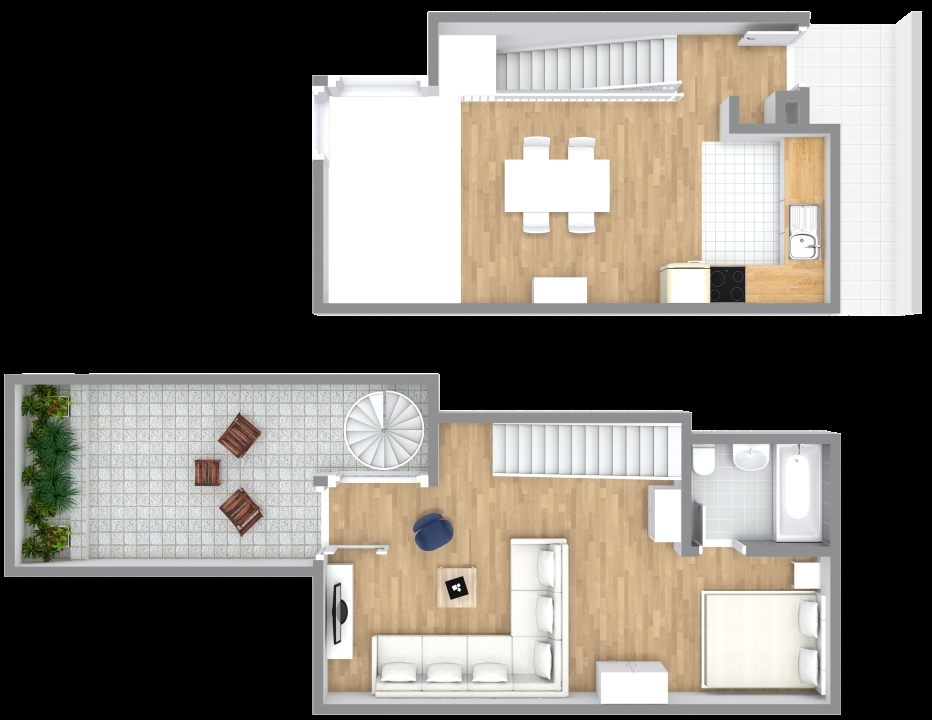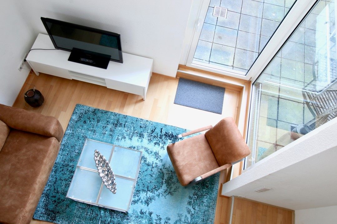 Quiet area, 2 levels, 1st-level: kitchen and dining room, 2nd level: living room with terrace and box-spring bed 1,60m, inkl. WiFi internet connection, bed linen and towels included, cleaning service possible at an extra charge, minimum term of lease 6 months, plus final cleaning 220,00 €