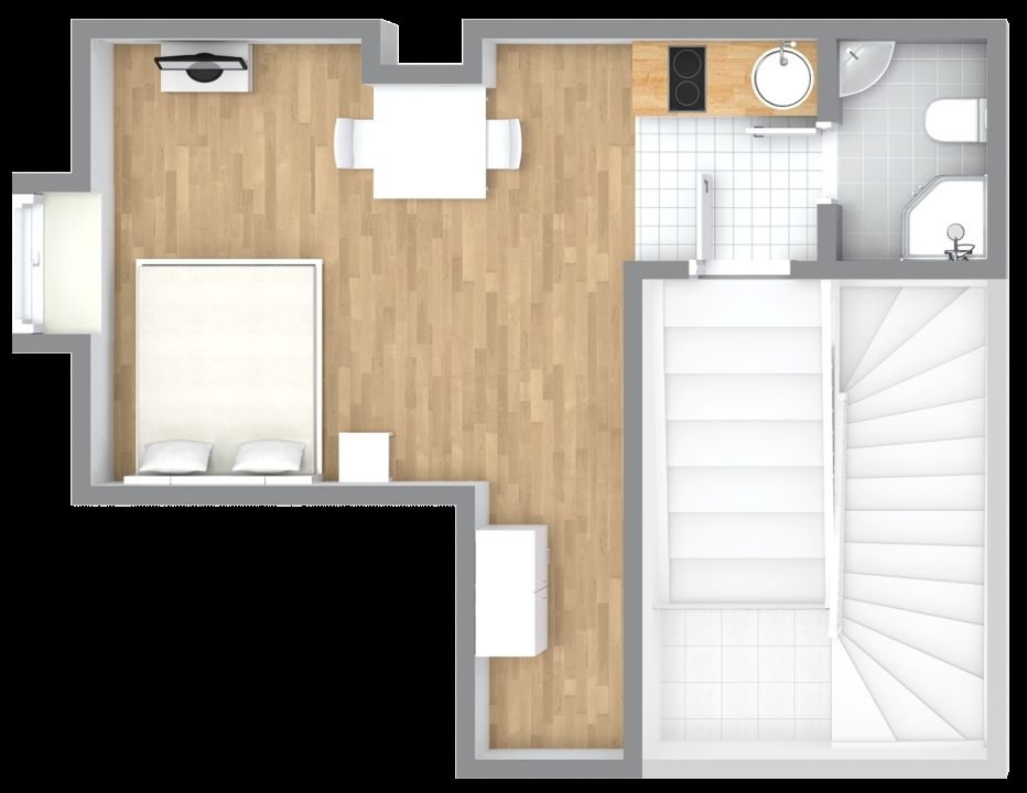 Modern furniture, parquet floor, separated kitchenette, bathroom with shower,
