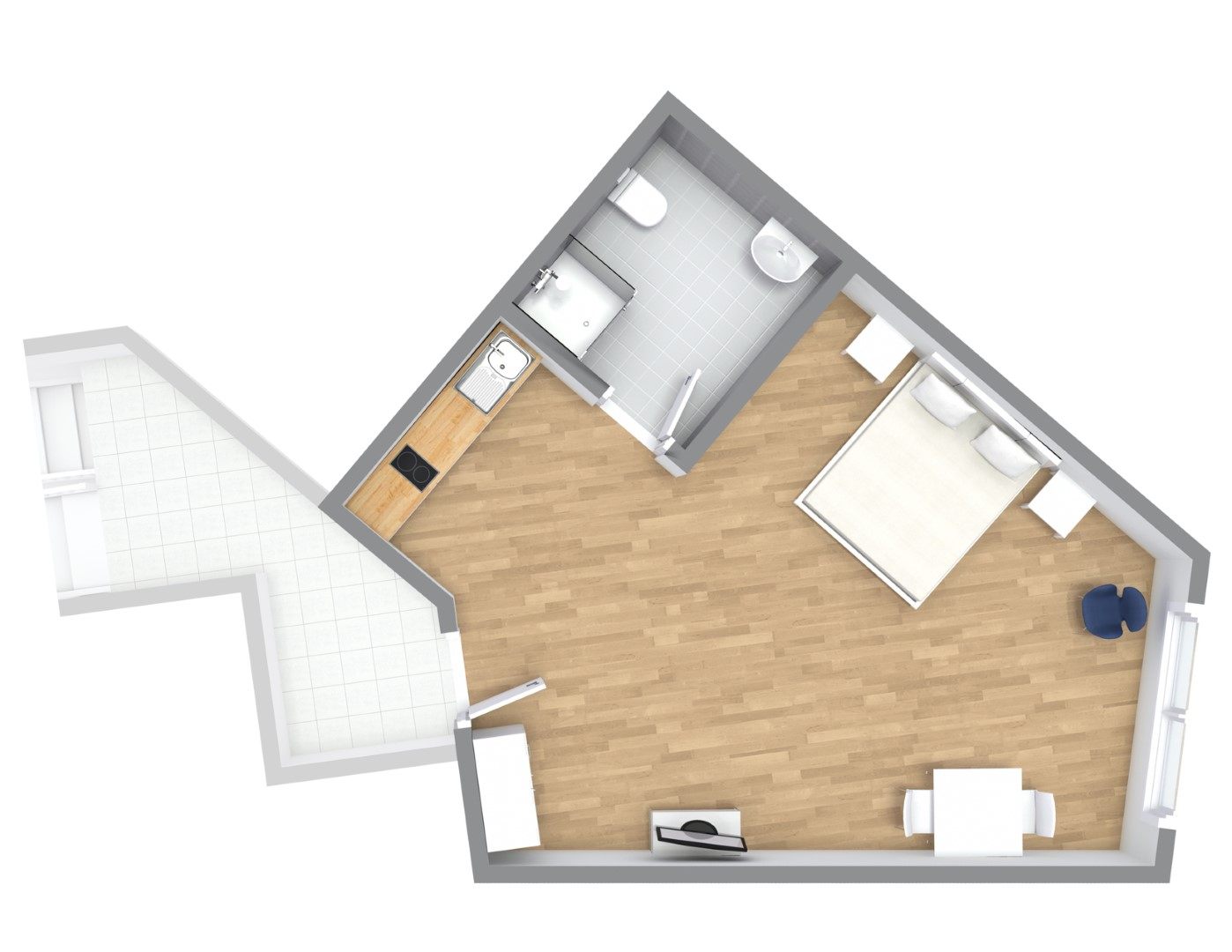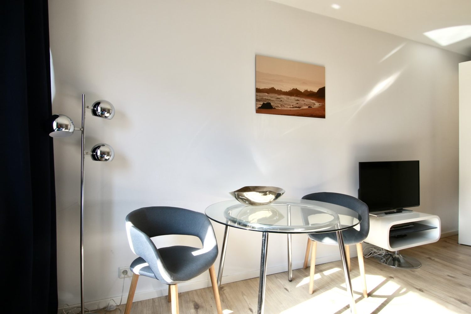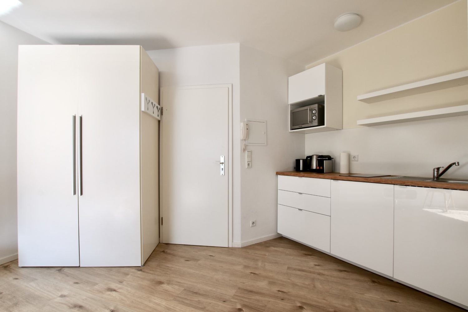 Balcony, living room / bedroom with queen-sized bed 1.40 m, bed linen and cleaning service optionally, laundry room in the basement, pets not allowed, DSL WiFi optionally for 8.00 Euros/week, minimum term of lease 2 months, plus final cleaning 100,00 €