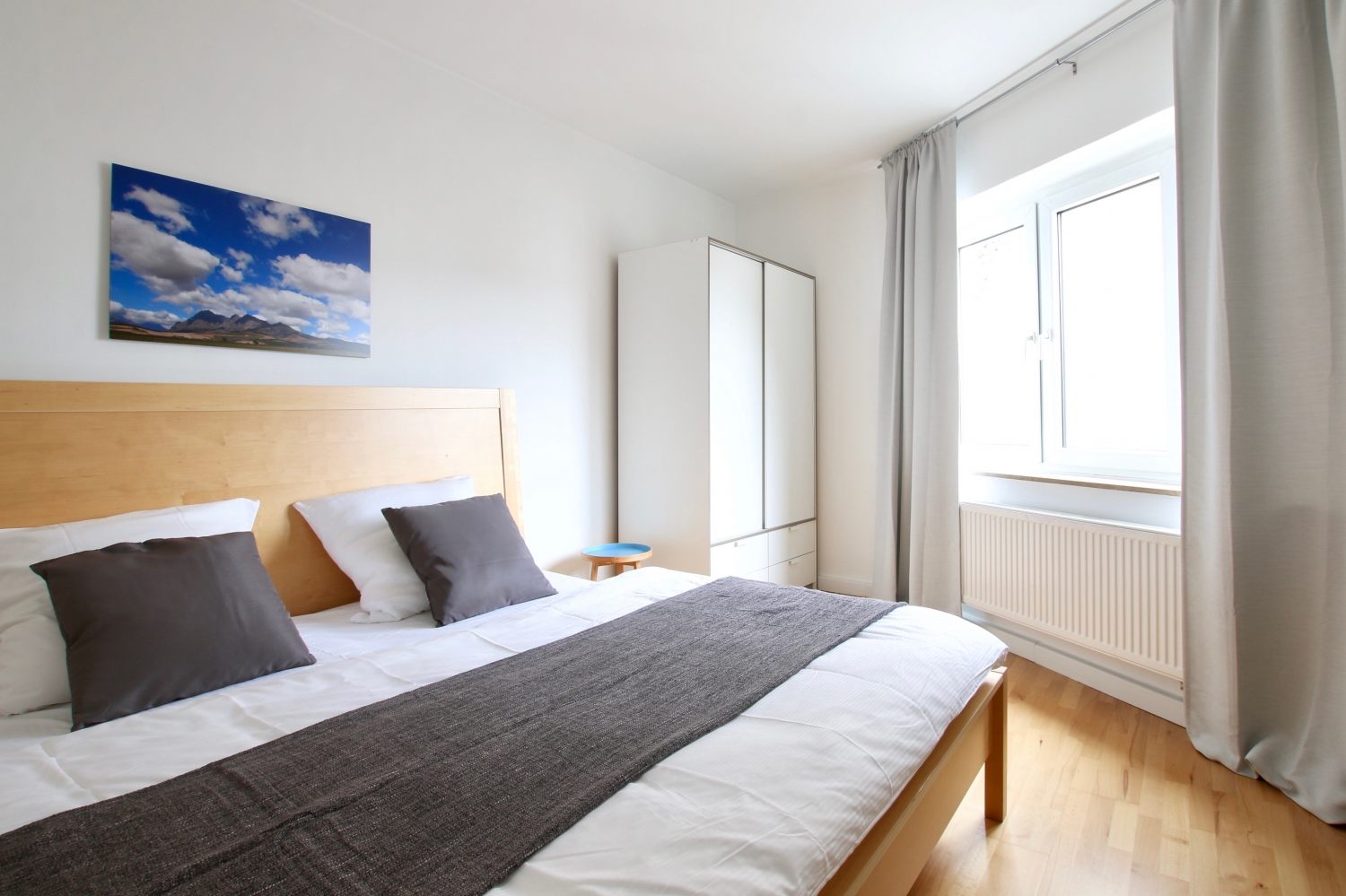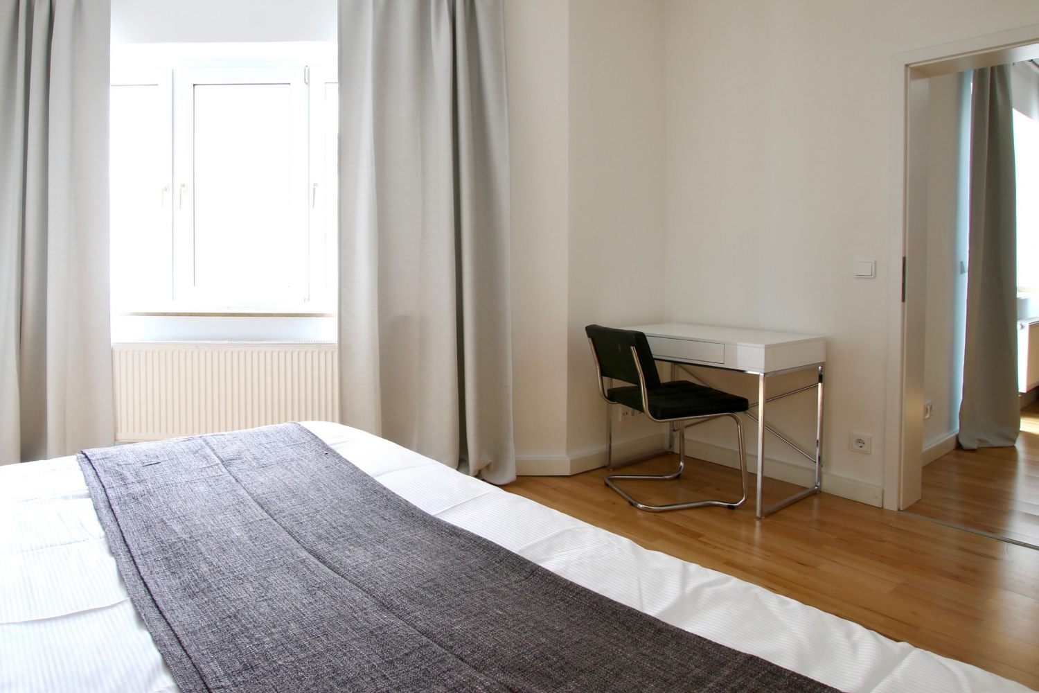 Balcony, living room, 1st bedroom with double bed 1.60 m, 2nd bedroom with queen-sized bed 1.40 m, bed linen and towels available, pets not allowed, smoking only on the balcony, WiFi optionally for 8.00 EUR/week, cleaning and laundry service optionally for a surcharge, minimum term of lease 6 months, plus final cleaning 320,00 €