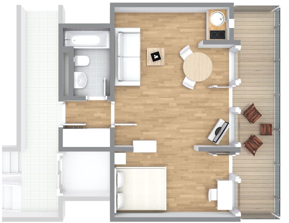 Modern furniture, parquet floor, integrated kitchenette with microwave, bathroom with tub,