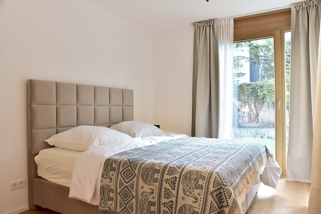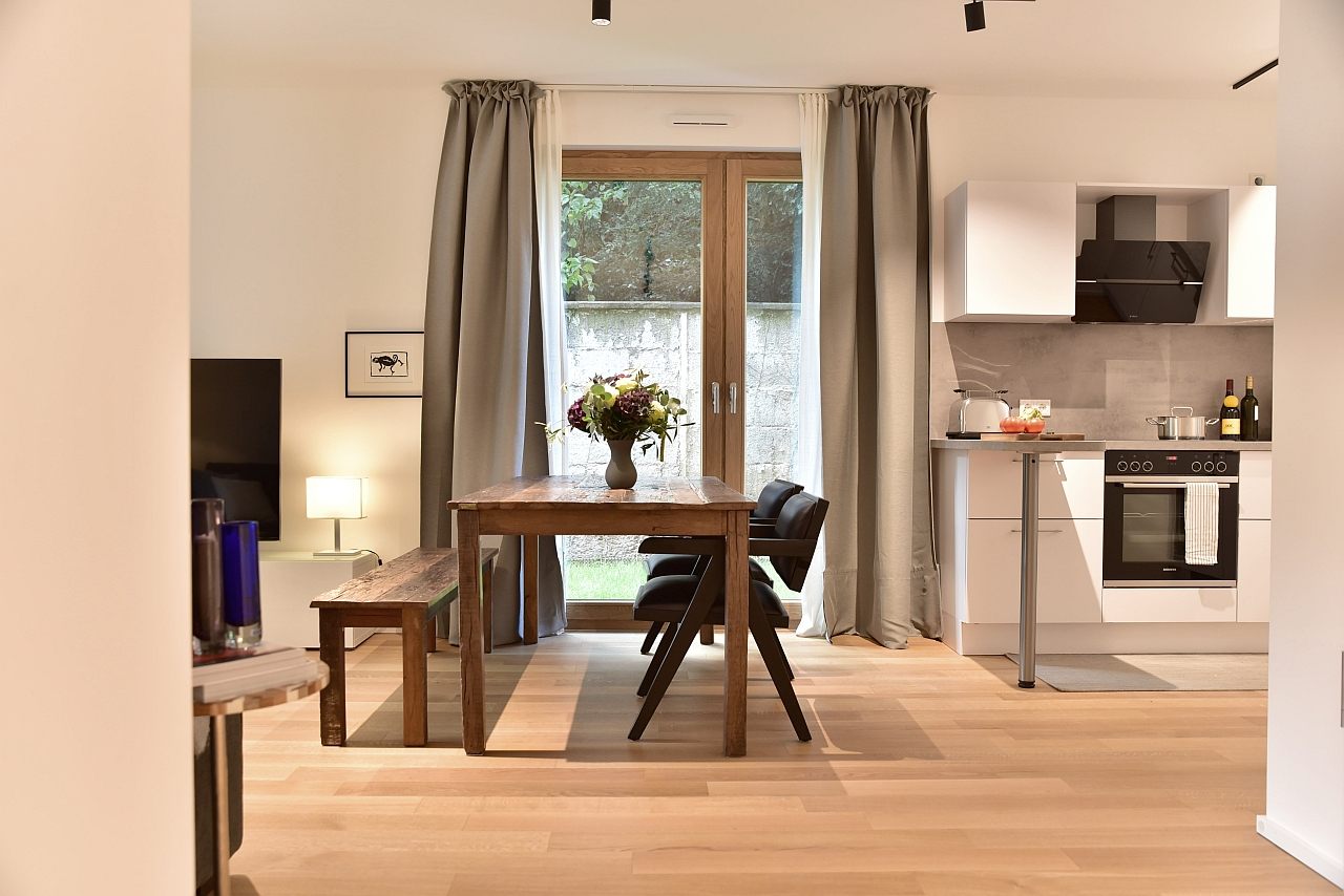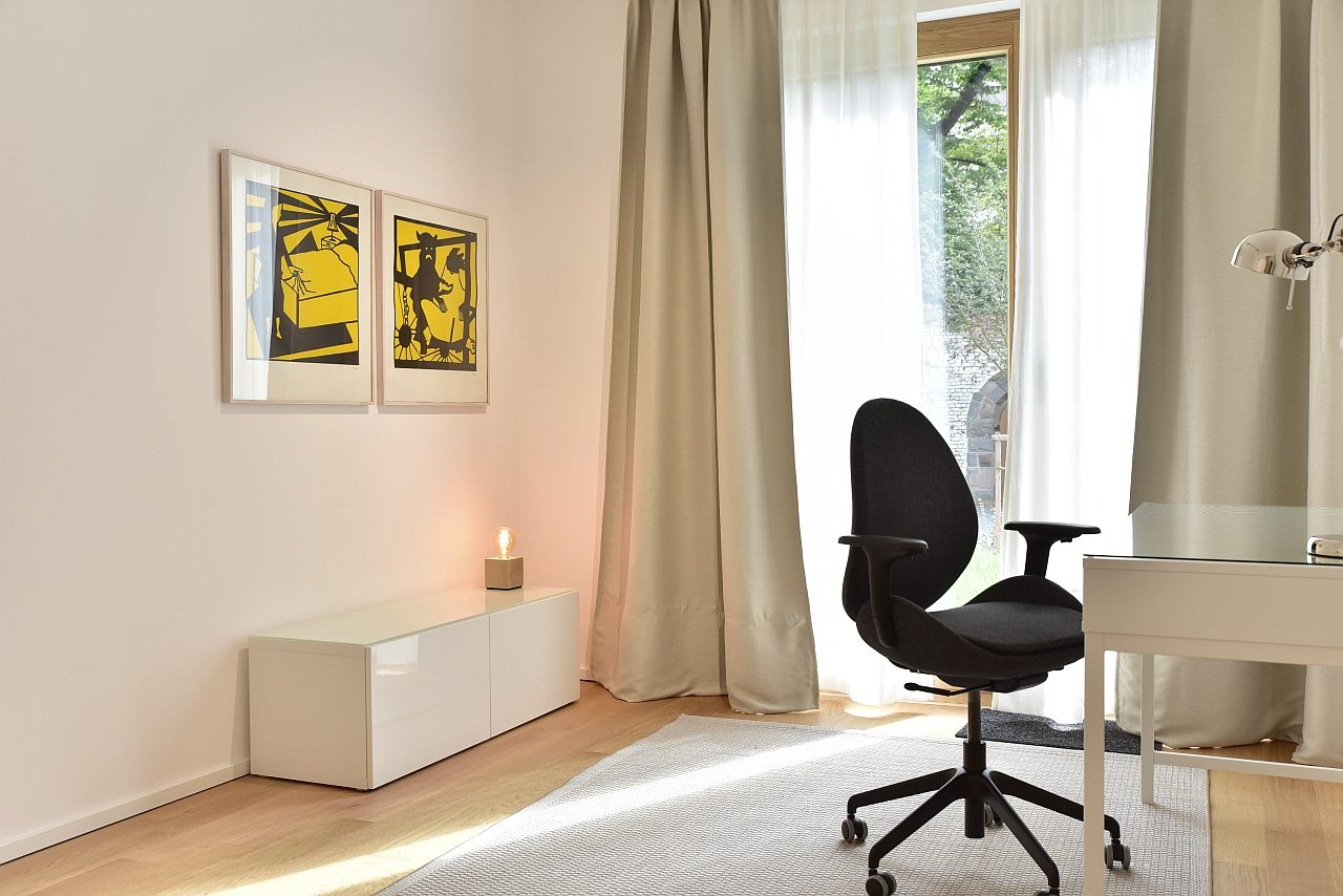 Terrace, living room, study, bedroom with double bed 1,80m, bed linen and towels available. Bed 1.80m, bed linen and towels available, incl. WIFI internet access, pets not allowed, parking space for an extra charge, charging station for an extra charge, non-smoking, max. 2 persons, minimum rental period 6 months
