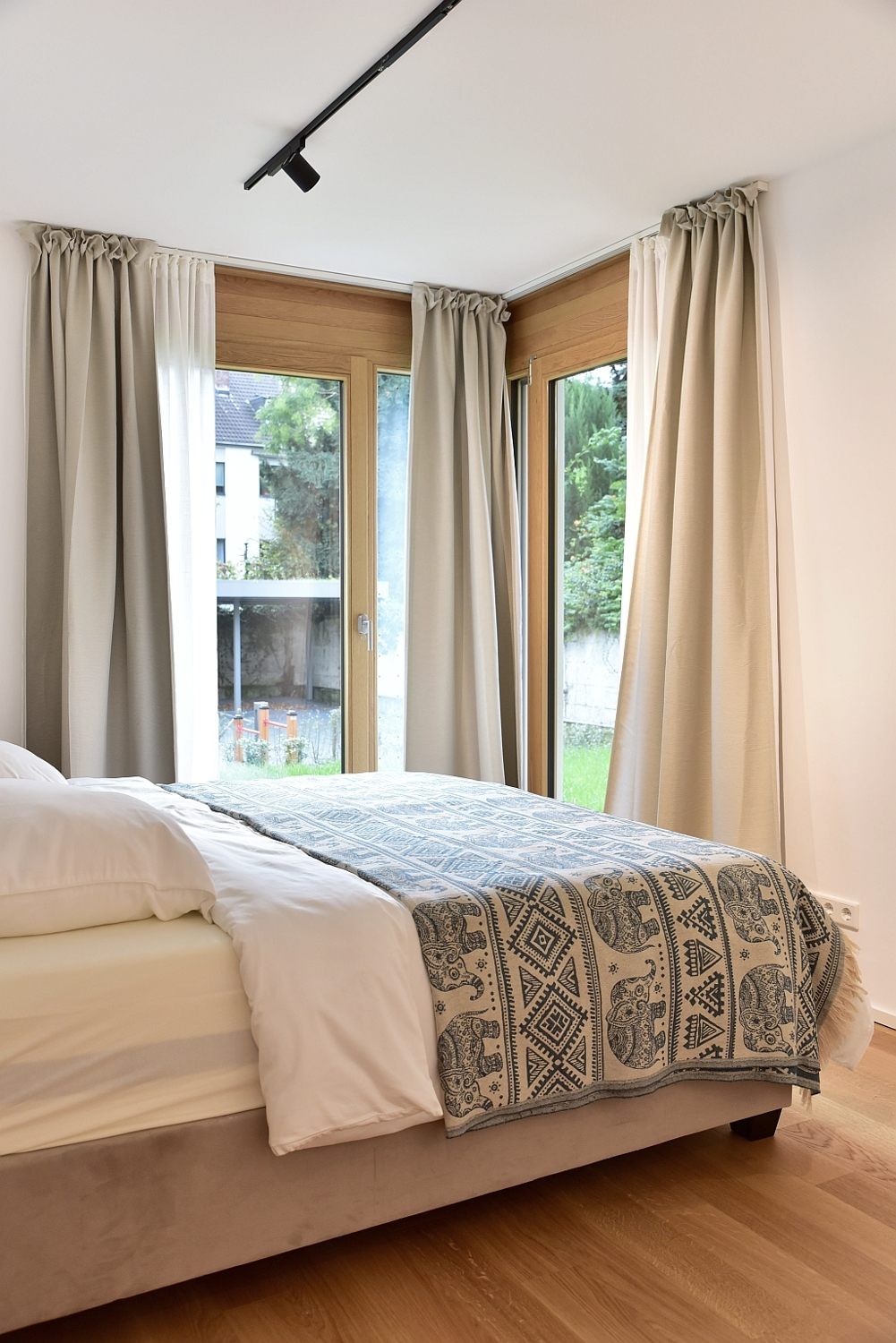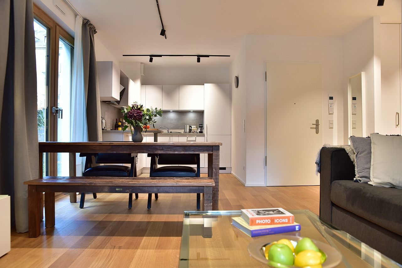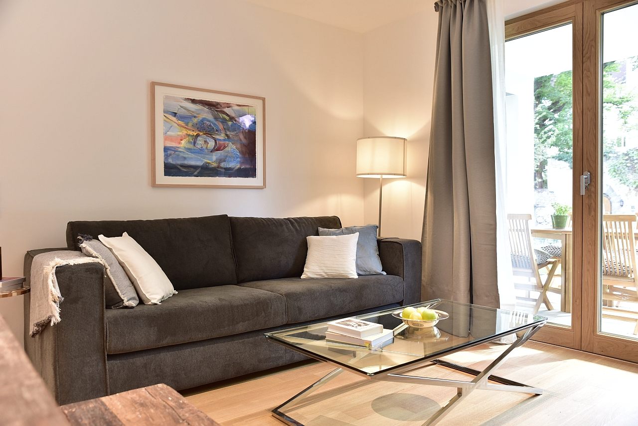 Terrace, living room, study, bedroom with double bed 1,80m, bed linen and towels available. Bed 1.80m, bed linen and towels available, incl. WIFI internet access, pets not allowed, parking space for an extra charge, charging station for an extra charge, non-smoking, max. 2 persons, minimum rental period 6 months