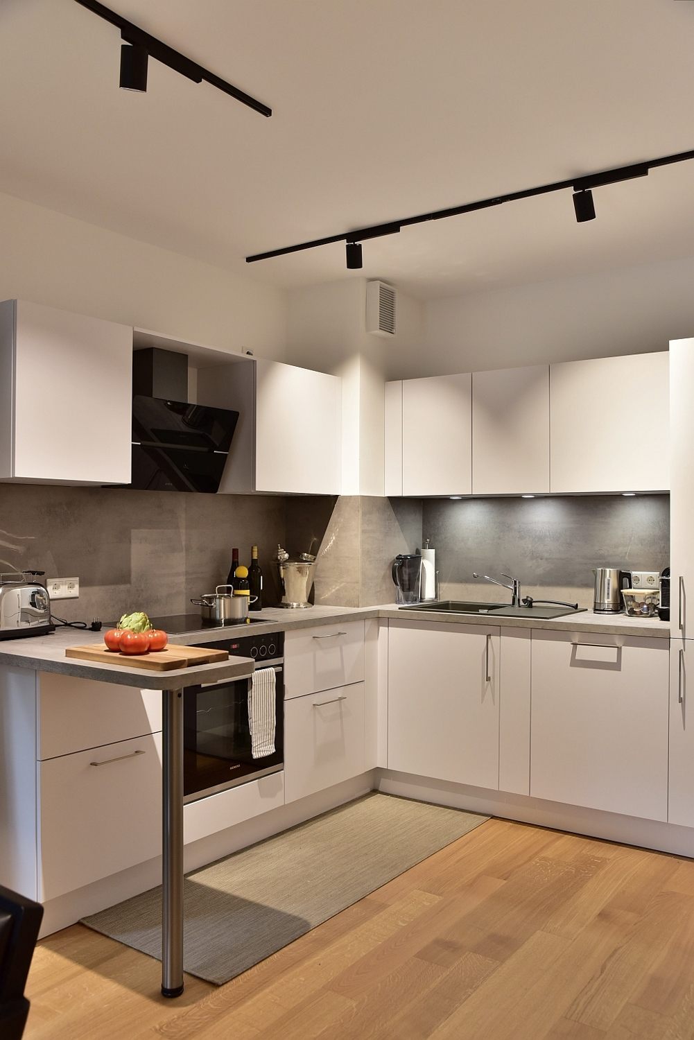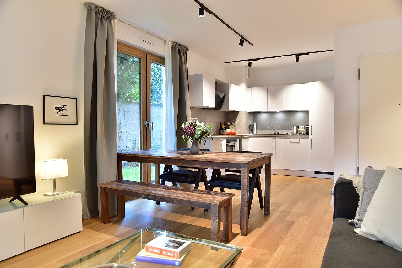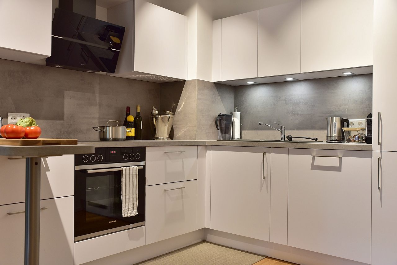 Modern furnishings, real wood floorboards, integrated fitted kitchen with dishwasher, oven and microwave, daylight shower room, Smart TV, WIFI internet access, washing machine for sole use in private cellar compartment