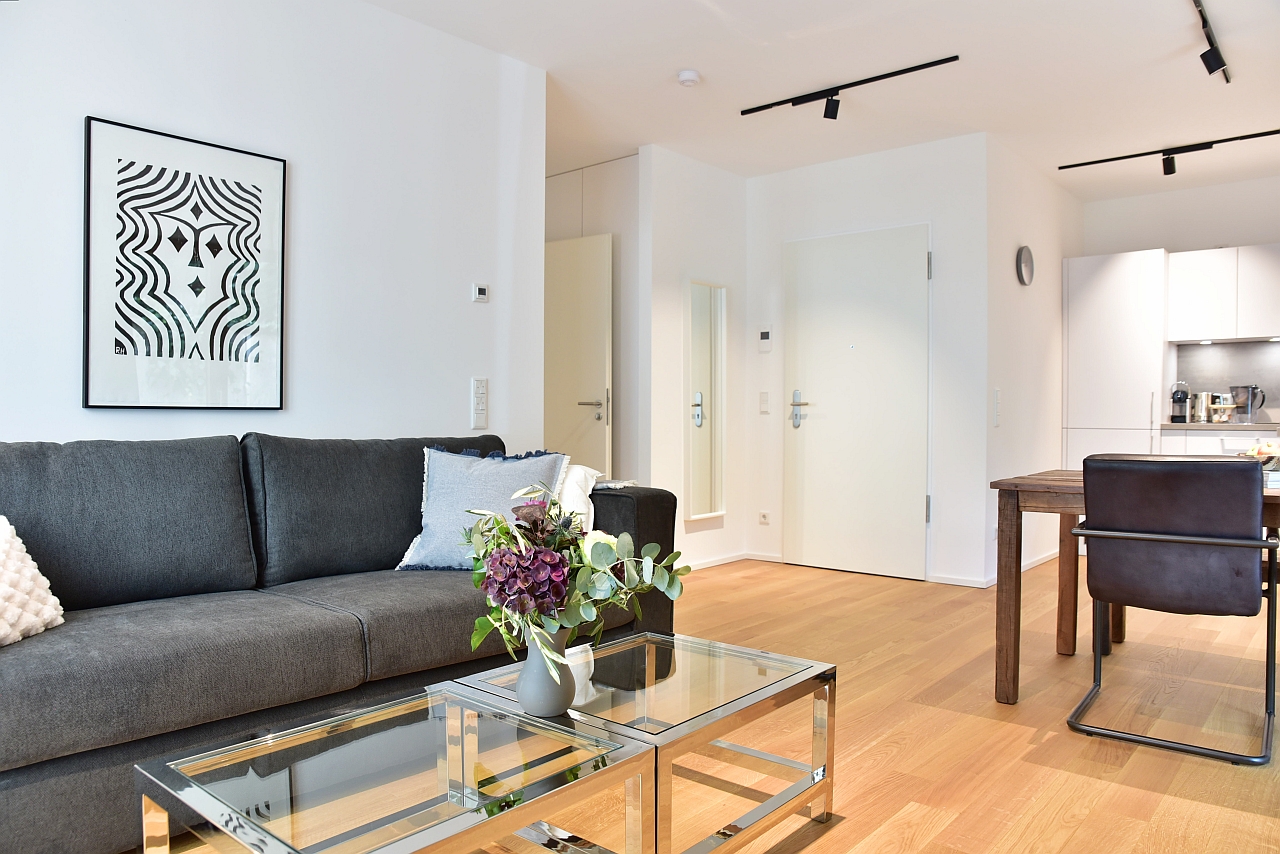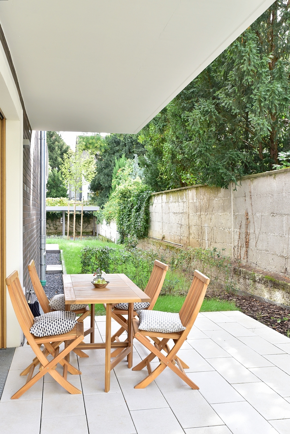 Terrace, living room, study, bedroom with double bed 1,80m, bed linen and towels available. Bed 1.80m, bed linen and towels available, incl. WIFI internet access, pets not allowed, parking space for an extra charge, charging station for an extra charge, non-smoking, max. 2 persons, minimum rental period 6 months