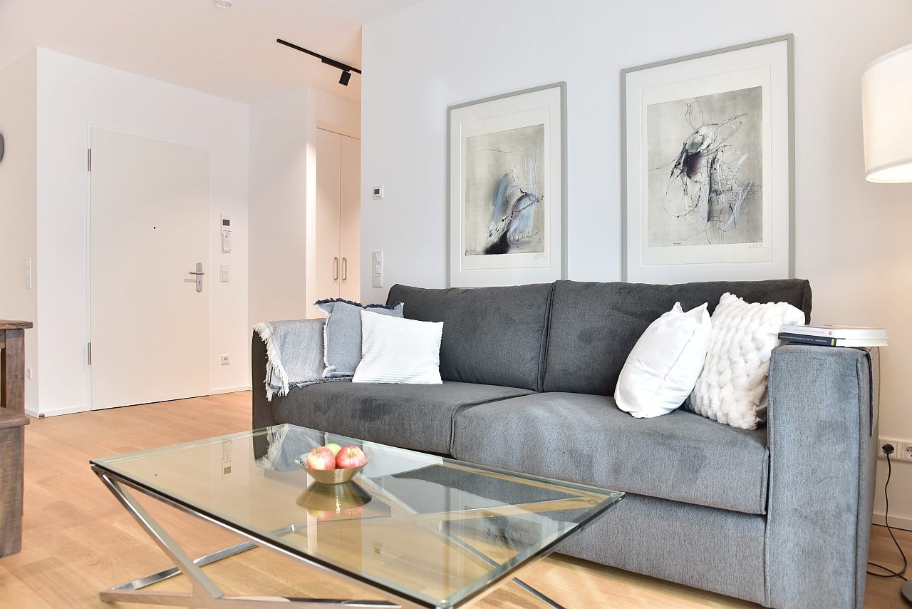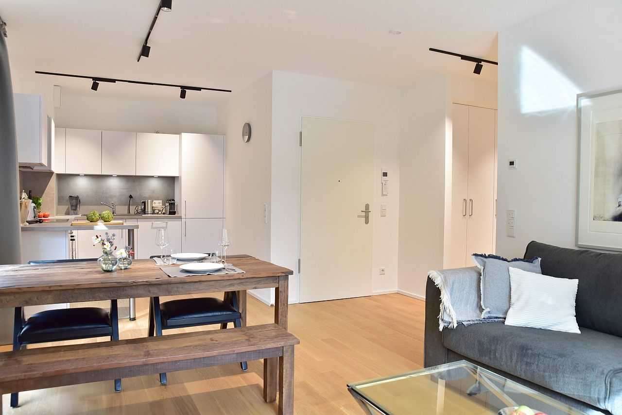 Terrace, living room, study, bedroom with double bed 1,80m, bed linen and towels available. Bed 1.80m, bed linen and towels available, incl. WIFI internet access, pets not allowed, parking space for an extra charge, charging station for an extra charge, non-smoking, max. 2 persons, minimum rental period 6 months