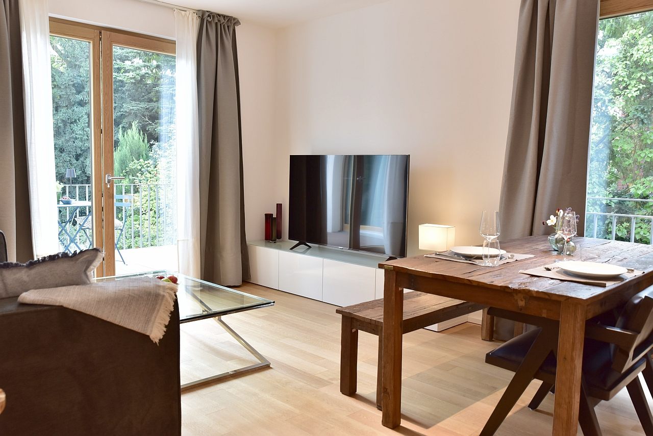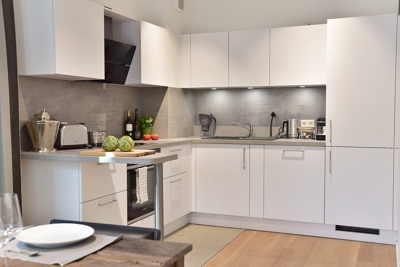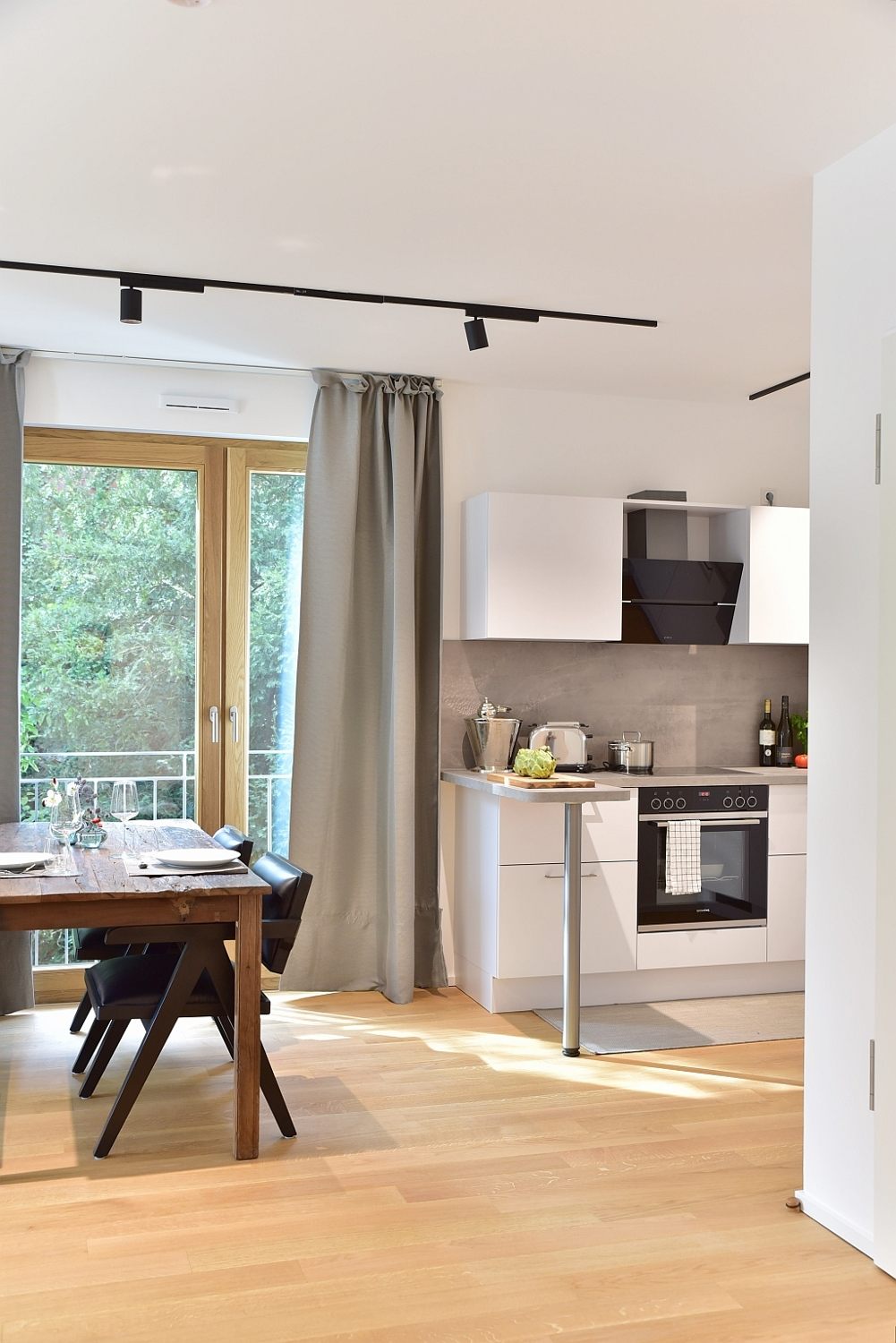 Modern furnishings, real wood floorboards, integrated fitted kitchen with dishwasher, oven and microwave, daylight shower room, Smart TV, WIFI internet access, washing machine for sole use in private cellar compartment