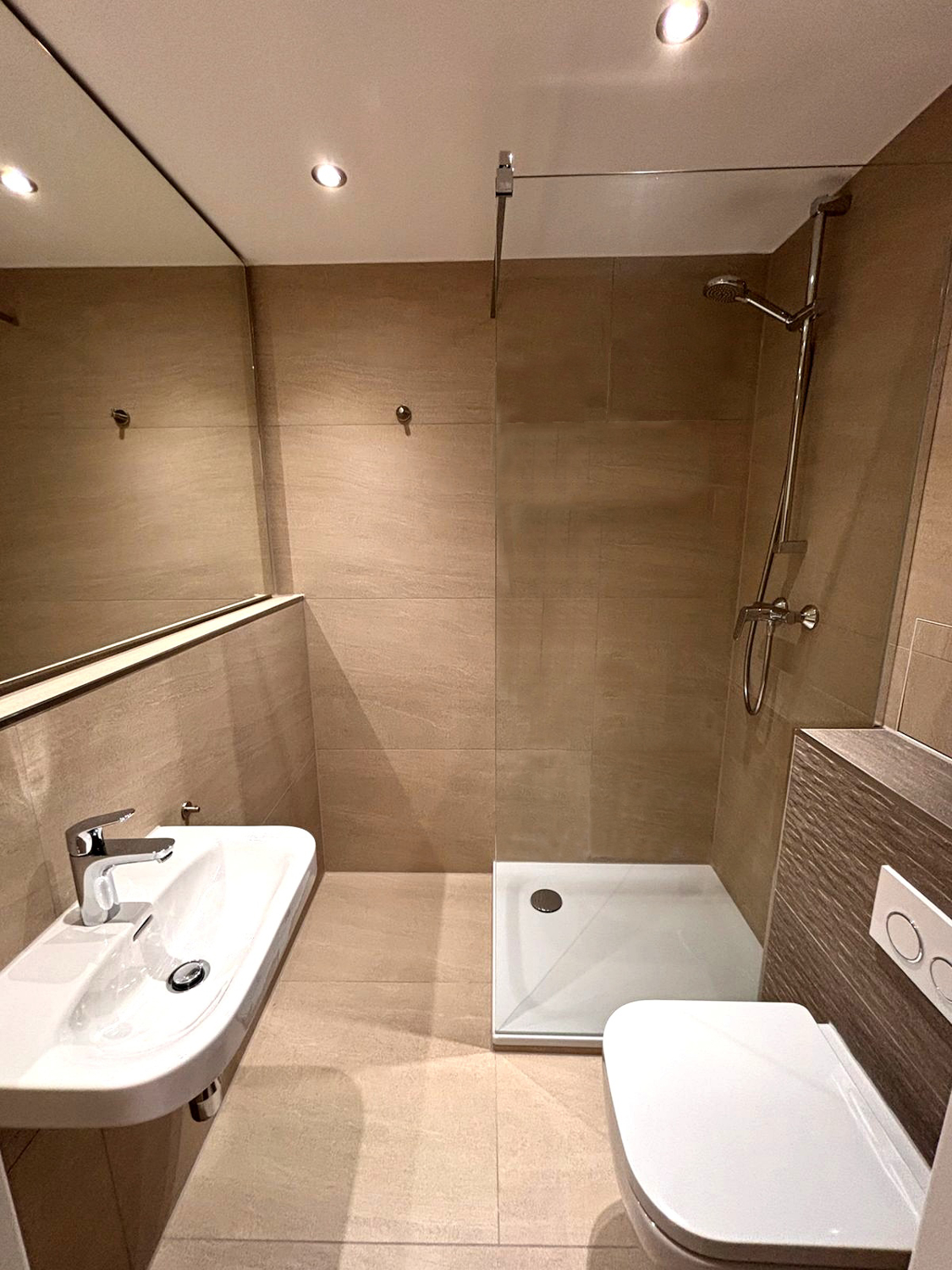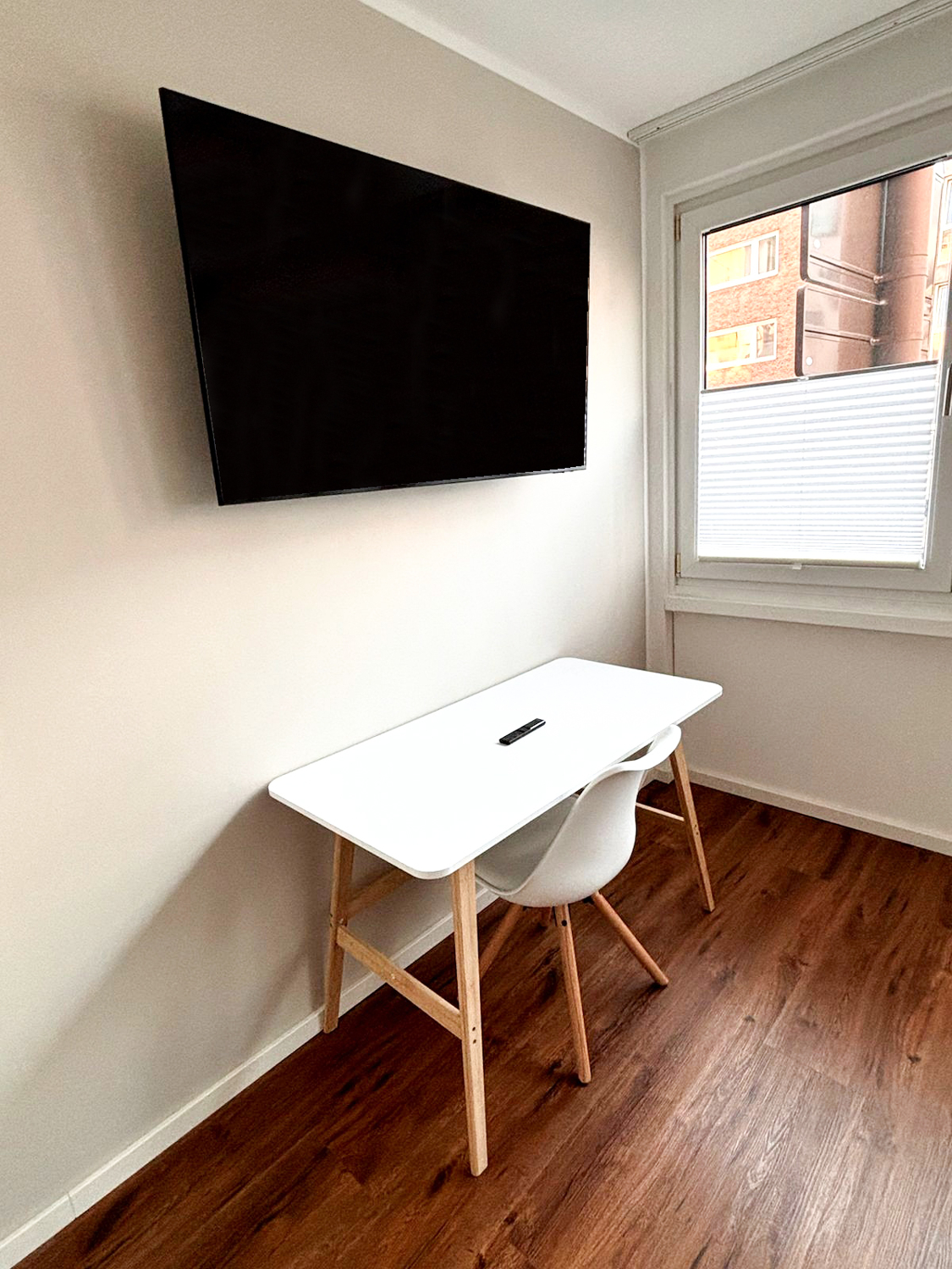 modern furnishings, tiled floor, integrated single kitchen with microwave and coffee machine, bath tub, cable TV, 55-inch flat screen, WiFi Internet access available for self registration, coin-operated washing machine in the basement