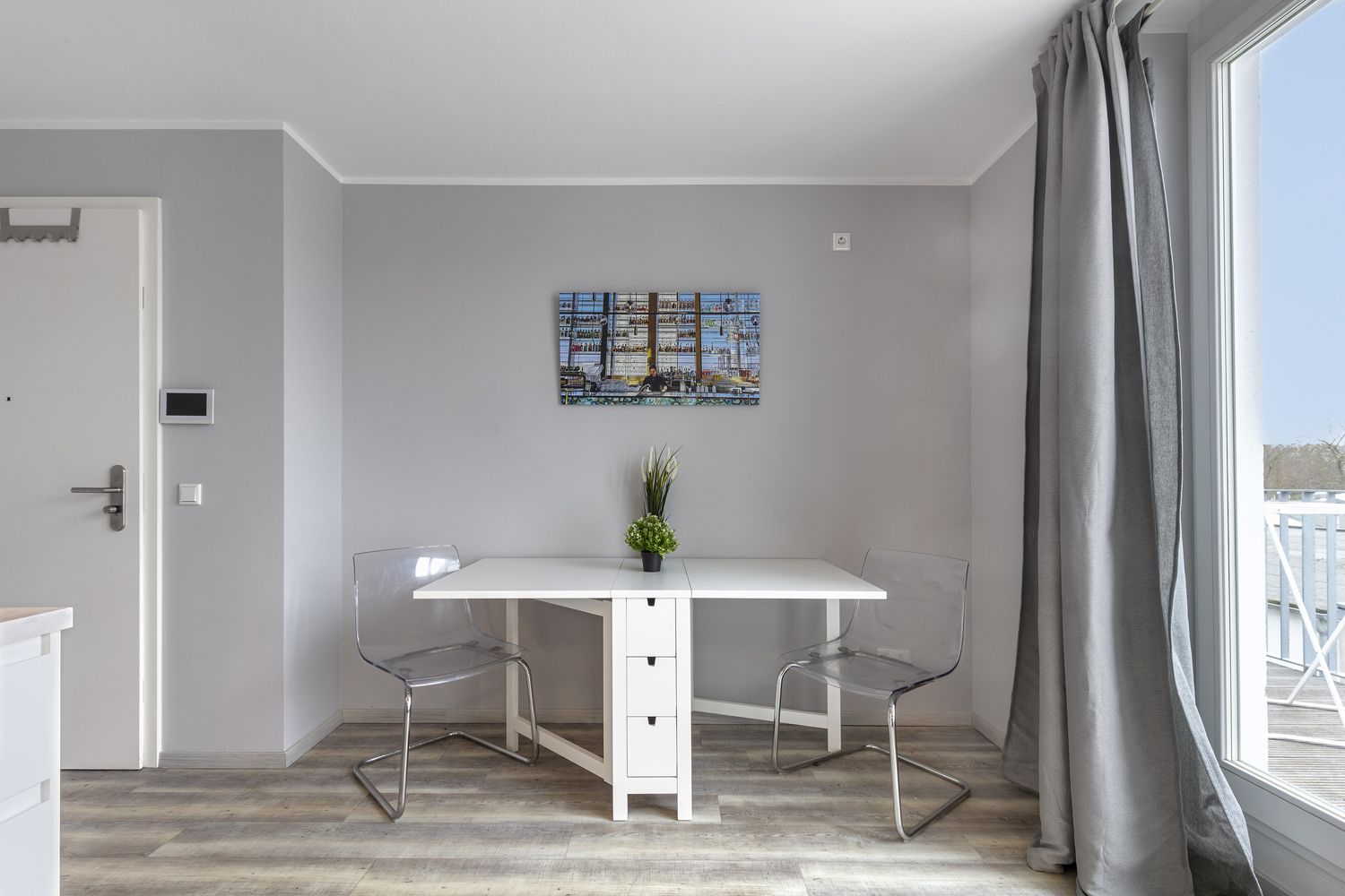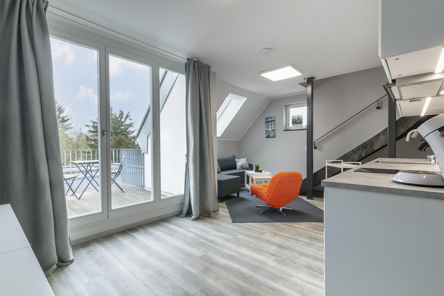 Terrasse, Wohn-/ Schlafzimmer mit Doppelbett 1,60 × 2,00 m und Récamiere mit Schlaffunktion, Bettwäsche und Handtücher vorhanden, inkl. Highspeed-Internetanschluss, Parkplatz optional nach Verfügbarkeit, Nichtraucher, Barrierefrei, Tierhaltung nicht gestattet, max. 2 Personen, 3 Monate Mindestmietzeit–