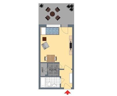 Modern furniture, laminated floor, kitchenette with microwave, bathroom with tube, cable TV, flatscreen with integrated WiFi router, internet, telephone, Washing machine in the basement