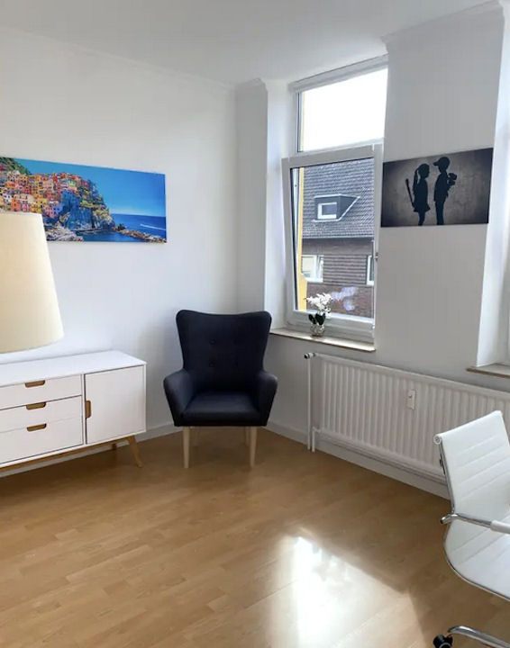 Terrasse und Garten zur Mitbenutzung bzw eigener Teilbereich, geräumiges Wohnzimmer, Schlafzimmer mit Boxspingbett 2,00m ruhig zum Garten gelegen, weiteres Zimmer als Büro oder Gästezimmer, Bettwäsche und Handtücher vorhanden, inkl. WLAN Internetanschluss, inkl. Hausmeisterservice, gute kostenfreie Parkmöglichkeiten vor dem Haus, Reinigungsservice optional gegen Aufpreis, Tierhaltung nach Vereinbarung, Nichtraucher, max. 3 Personen, Mindestmietdauer 3 Monate — Miete inkl. Nebenkosten: 2150 Euro pro Monat, inkl. Strom, u Heizung, plus 200 Euro Endreinigung