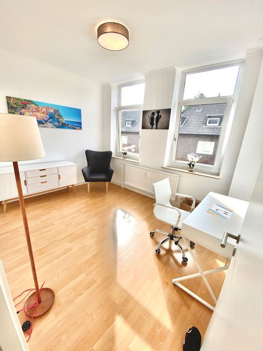 Terrasse und Garten zur Mitbenutzung bzw eigener Teilbereich, geräumiges Wohnzimmer, Schlafzimmer mit Boxspingbett 2,00m ruhig zum Garten gelegen, weiteres Zimmer als Büro oder Gästezimmer, Bettwäsche und Handtücher vorhanden, inkl. WLAN Internetanschluss, inkl. Hausmeisterservice, gute kostenfreie Parkmöglichkeiten vor dem Haus, Reinigungsservice optional gegen Aufpreis, Tierhaltung nach Vereinbarung, Nichtraucher, max. 3 Personen, Mindestmietdauer 3 Monate — Miete inkl. Nebenkosten: 2150 Euro pro Monat, inkl. Strom, u Heizung, plus 200 Euro Endreinigung