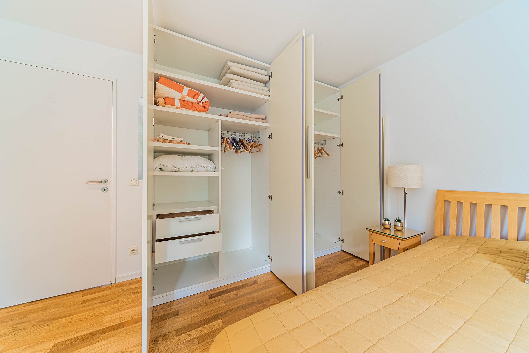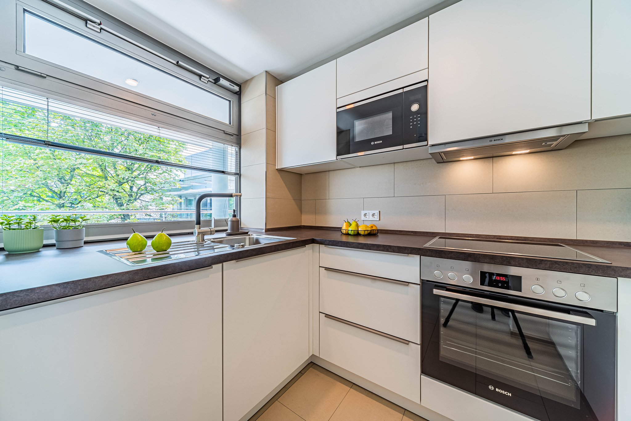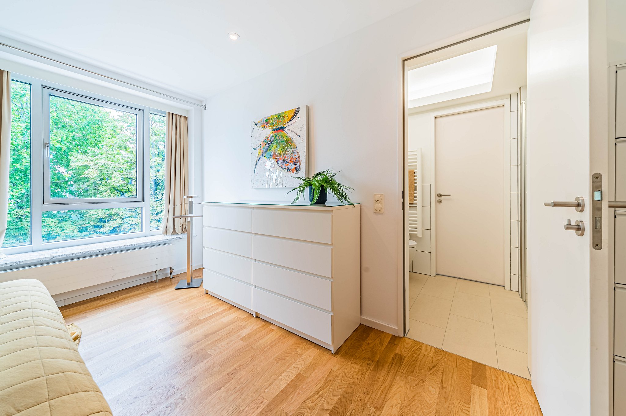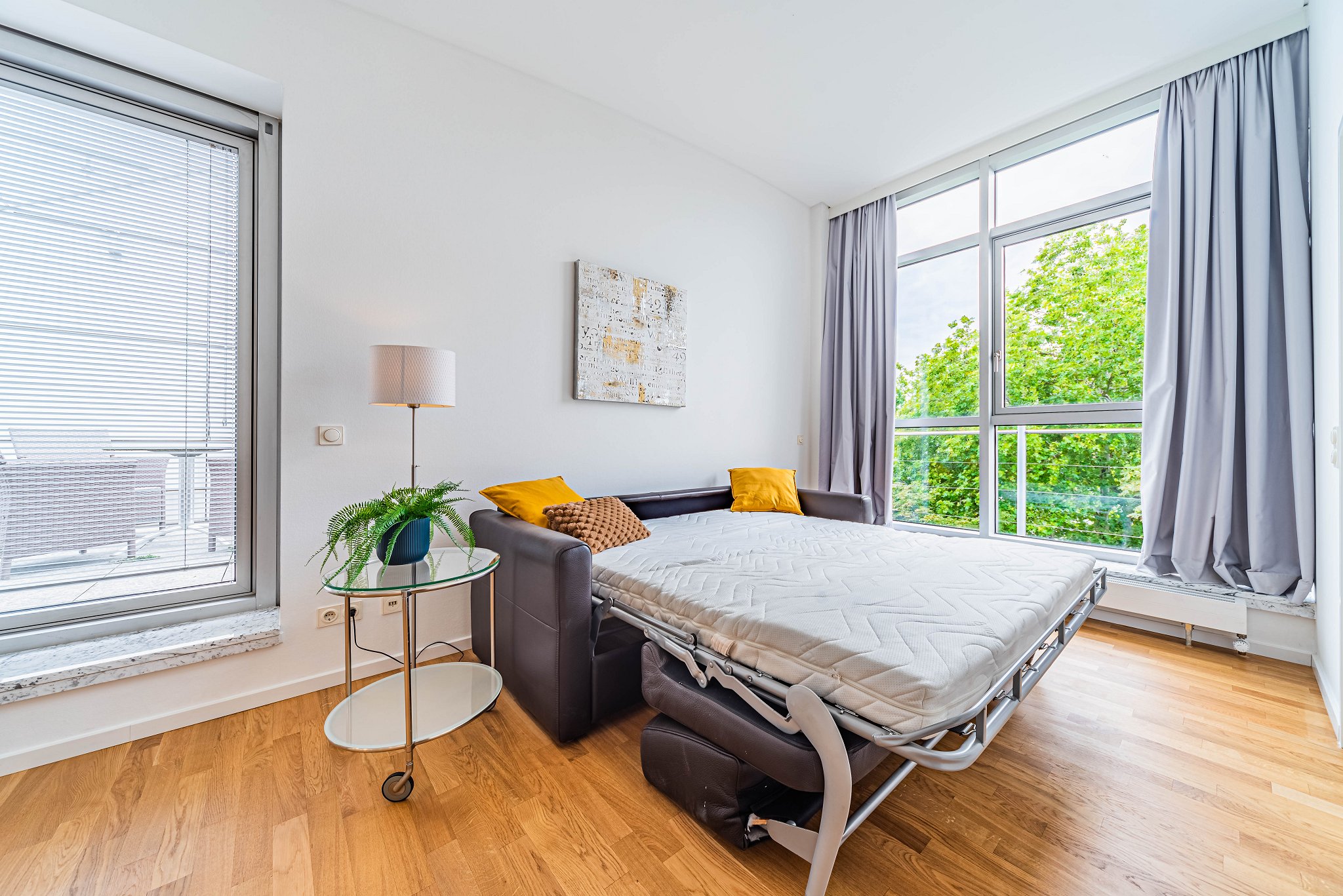 - Large modern windows, blackout curtains